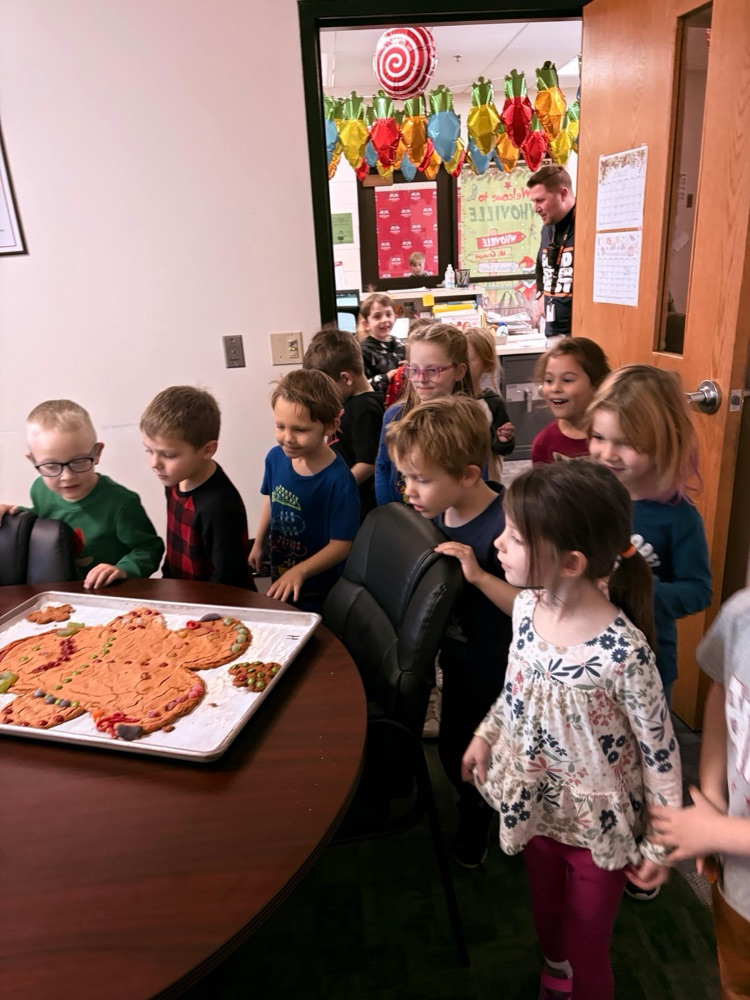 Kindergarten classes were treated to a visit from retired teacher Jeff Stultz who helped each class make gingerbread dough before they decorated a giant cookie in the shape of a boy or girl. After baking, the students searched for the cookies throughout the building. Many of the cookies ended up in Principal’s office to be found by the students. Thanks to the Kindergarten team for creating this memorable experience.